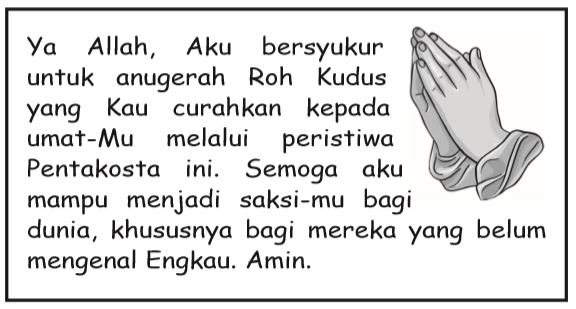 Nah, anak-anak, dalam perayaan Pentakosta ini, mari kita juga menimba inspirasi dan kekuatan dari Roh Kudus bagi kerasulan kita di zaman ini. Kiranya kita tidak menjadi takut untuk mewartakan nilai-nilai, pesan kekatolikan dalam keseharian hidup kita melalui tindakan dan perbuatan. Hidup keseharian kita sekurang-kurangnya menjadi kesaksian yang nyata bagi nilai-nilai Injil. Hidup kita seharusnya menjadi Injil yang hidup.