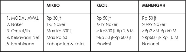 Catatan :• Nomor 1, 3 dan 4 berdasarkan UU Nomor 20 Tahun 2008• Nomor 2 menurut BPS• Nomor 5 menurut UU Nomor 23 tahun 2014.Mengapa UMKM membutuhkan modal awal lebih banyak? Karena UMKM diyakini lebih memiliki pengaruh terhadap perkembangan ekonomi di Indonesia dan atau mendapatkan bantuan dari pemerintah, lagi pula UKM dinilai bersifat lebih perorangan dengan usaha dan keuntungan relatip kecil. Home Industri tempe kedelai dan pupuk kandang serta jasa belanja online bersifat individu (umat Paroki Cikarang ada yang sudah menekuni bidang ini dan berprospek sangat menjanjikan)