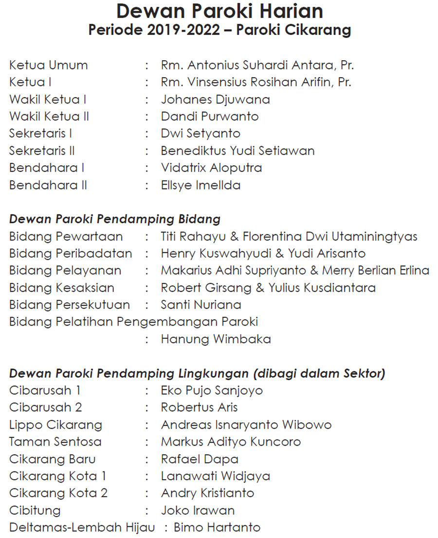 Sabtu, 22 Juni 2019, Paroki Cikarang menerima kehadiran Uskup Keuskupan Agung Jakarta, Mgr. Ignatius Suharyo yang berkenan menutup Novena Tubuh dan Darah Kristus, sekaligus melantik Dewan Paroki Harian (DPH) Paroki Cikarang periode 2019-2020.
