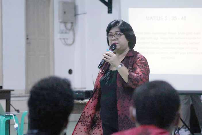 Masuk ke sesi materi oleh Ibu A.G Evrydawati. Beliau menyampaikan bahwa “Cinta kasih tidak melulu harus dengan pasangan, bisa dengan keluarga, teman, diri kita sendiri, bahkan musuh kita sekalipun. Arti Cinta Kasih yang sangat luas maknanya, bisa kita aplikasikan dengan berbagai cara seperti menolong, berbagi, dan sikap peduli terhadap sesama”. Diakhir materi Bu Evry juga mengajak para peserta dan panitia untuk bernyanyi bersama diiringi oleh musik dengan judul lagu "Melukis Senja" dari Budi Doremi . Semua tampak antusias dan meriah dalam sesi ini.