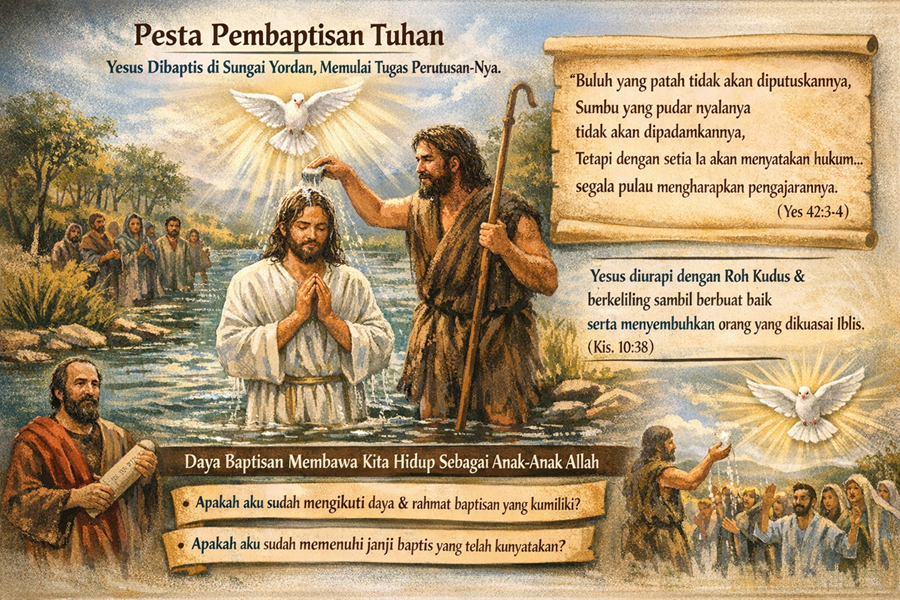 Pada hari Minggu ini kita merayakan Pesta Pembaptisan Tuhan. Pembaptisan Yesus di sungai Yordan menjadi pemakluman atas dimulainya tugas perutusan-Nya.