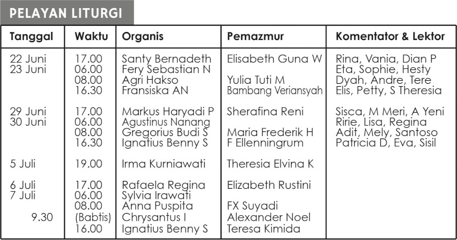 Jadwal Petugas Liturgi - Bulan Juni dan Juli 2024