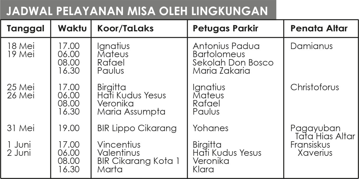 Jadwal Petugas Liturgi - Bulan Mei dan Juni 2024