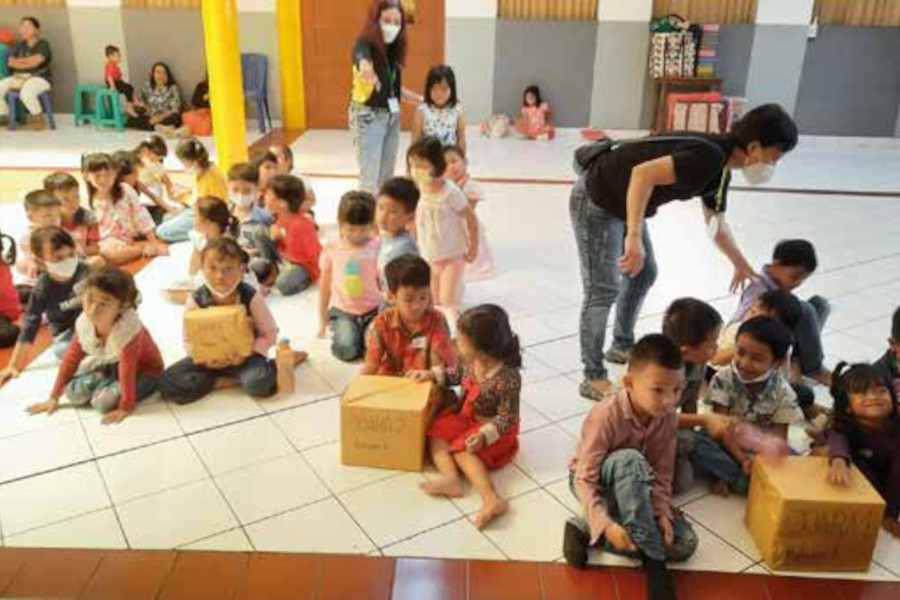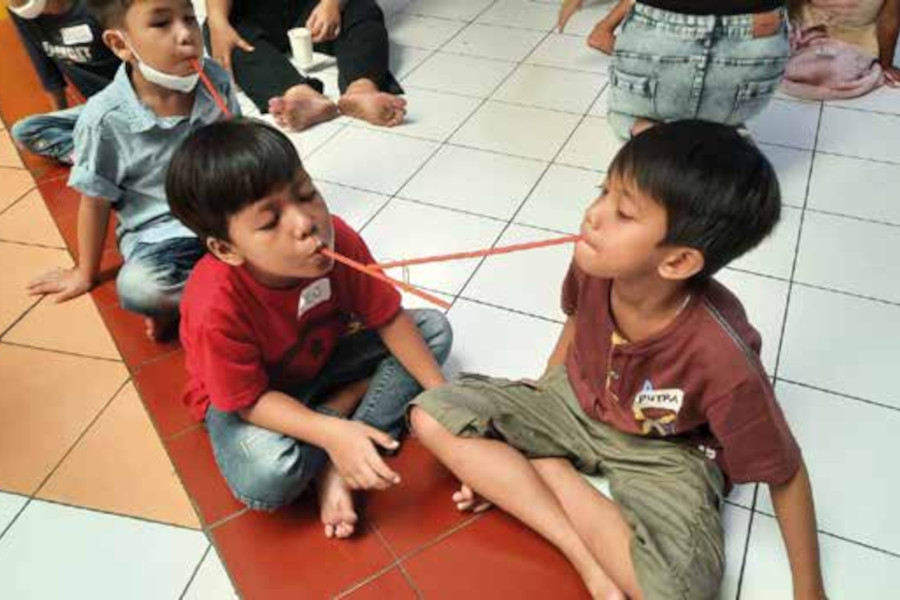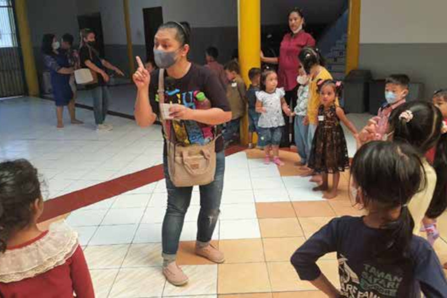 Kegiatan ini dibagi menjadi 2 kelompok yaitu Kelompok Besar (usia diatas 7 tahun) dan Kelompok Kecil (2-6 tahun). Kegiatan untuk kelompok kecil seperti menyusun paper cup, memindahkan bola dan estafet karet. Untuk kelompok besar kegiatannya estafet karet, bola dan hulahup serta bisik kata. Sebelumnya diawali dengan berdoa, bernyanyi bersama serta menonton film pendek. Anak-anak terlihat antusias dan penuh semangat. Pembina dengan sepenuh hati mendampingi anak-anak hingga tiba waktu mereka misa.