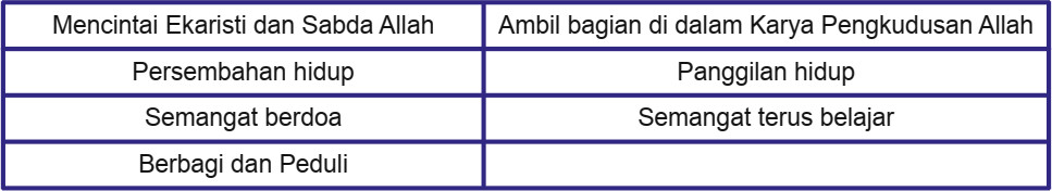 Untuk poin ketiga : “Bukan seorang peminum” : bukan maksudnya melarang sama sekali minum, namun tidak mabuk dan tetap bijaksana. Karena kalau sudah mabuk : poin nomor 1 dan 2 akan hilang dengan sendirinya. Kegiatan dilanjutkan dengan diskusi kelompok untuk mendefinisikan nilainilai paguyuban prodiakon, di mana sebelumnya sudah memiliki motto yaitu “Inilah aku, utuslah aku”. Nilai-nilai yang diperoleh dari diskusi kelompok : setia, rendah hati, taat, penuh tanggung jawab, pengembangan diri, dan tulus ikhlas. Acara pun berakhir.